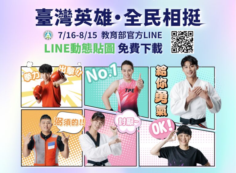 巴黎奧運即將盛大開幕,教育部LINE官方帳號(ID: @moe_tw)推出「臺灣英雄・全民相挺」動態貼圖,提供民眾免費下載,號召全民一起為巴黎奧運選手喝采!