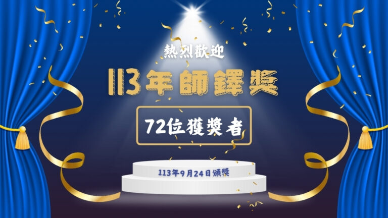113年師鐸獎獲獎名單,今年共計選拔出72名獲獎者,其中男性41名、女性31名;校(園、院)長19名、教師50名、軍護人員1名、運動教練2名;獲獎者來自幼兒園1名、國小25名、國中15名、高中19名、大專校院10名、特殊教育學校1名及矯正學校1名。